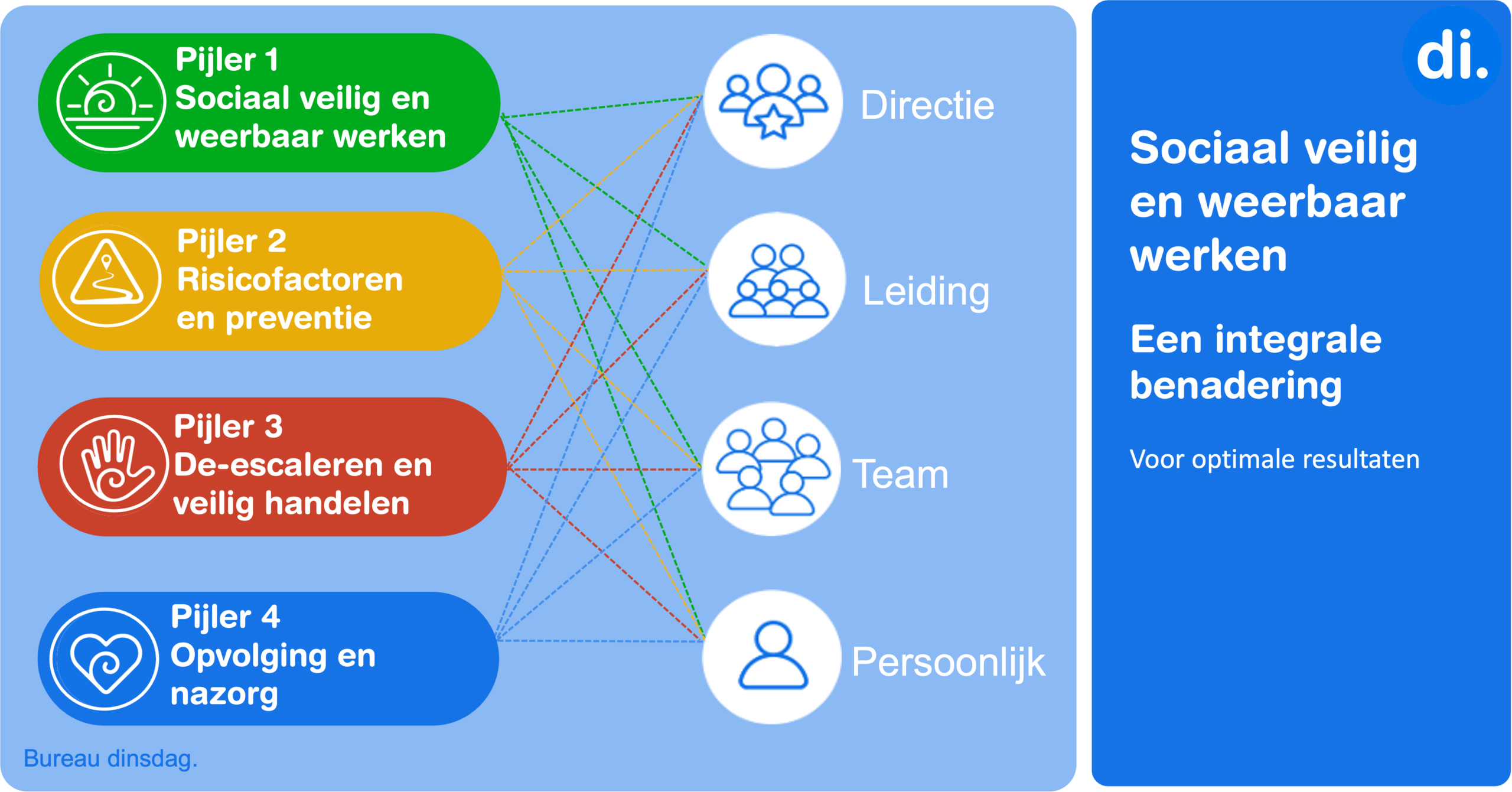 Bij Bureau dinsdag werken we vanuit onze heldere en praktische integrale veiligheidsbenadering. We starten bij de gewenste situatie en kijken naar de risico’s en manieren om te de-escaleren die past bij jouw werksituatie.